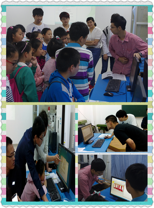 职业体验日的第一天,上午10点,我信息技术系迎来了第一批“小客人”,一走进我们的活动室,小朋友们就被Unity 3D游戏深深吸引了,伴随着优美的旋律,小朋友们也慢慢地舞动起来,亲身体验了神奇的计算机触感的隔空效果;我系软件小天才曹元义首先通过“鸡兔同笼” 问题,给小朋友们详细讲解了数学知识是如何和编程联系在一起的,通过绘画工具和小朋友们一起画画,引出自编的小游戏并给他们进行了详细的过程讲解,让他们也亲身体验了一把程序带来的神奇;看着大屏幕循环播放视频解说智能家居物联网的最新知识,我系洪宇与邢小磊同学带领小朋友们进入了高端物联网的世界,详细演示了电动防盗锁等的使用,在神奇的物联网世界里,小朋友们居然提出了好多好奇的问题,在场的老师以及计算机专业的大哥哥们都一一做了详细解说。才第一天就吸引了一批又一批家长带着他们的孩子前来挑战。小朋友们听得非常认真,听着解说一一在自己的笔记本中记下内容,手里的相机不停地记录下自己的所见所闻,今天可以说他们是满载而归。