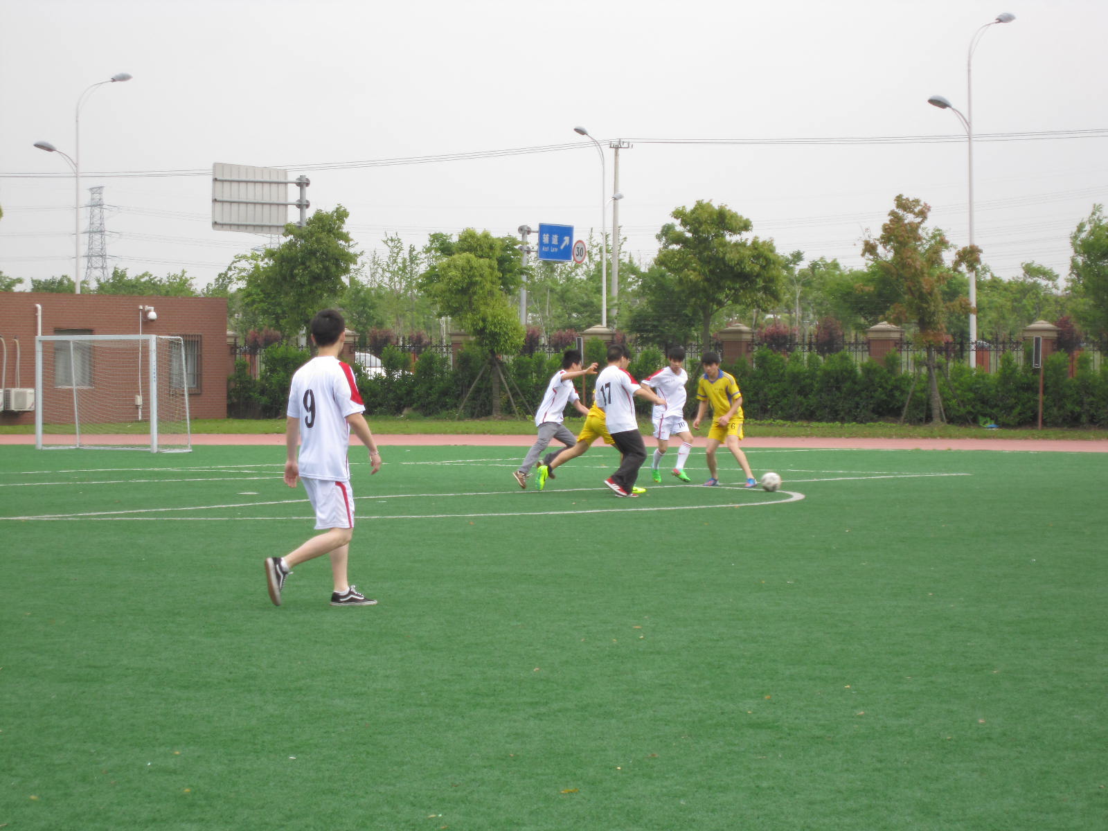 我系足球队一路过关斩将,顺利进入半决赛,上半场开场不到一分钟,我系首开纪录1:0。场外观众席我系老师队伍中不时传来激动的喝彩声。上半场结束,我系以4:1领先外语系。稍作休息后,下半场开始。下半场中,似乎所有队员都拼劲了全力。但我系健儿依旧发扬更高、更快、更强的体育精神,凭着矫健的步伐、灵活的运球技术以及良好的团队协作,以10:1的绝对优势挺进决赛。
