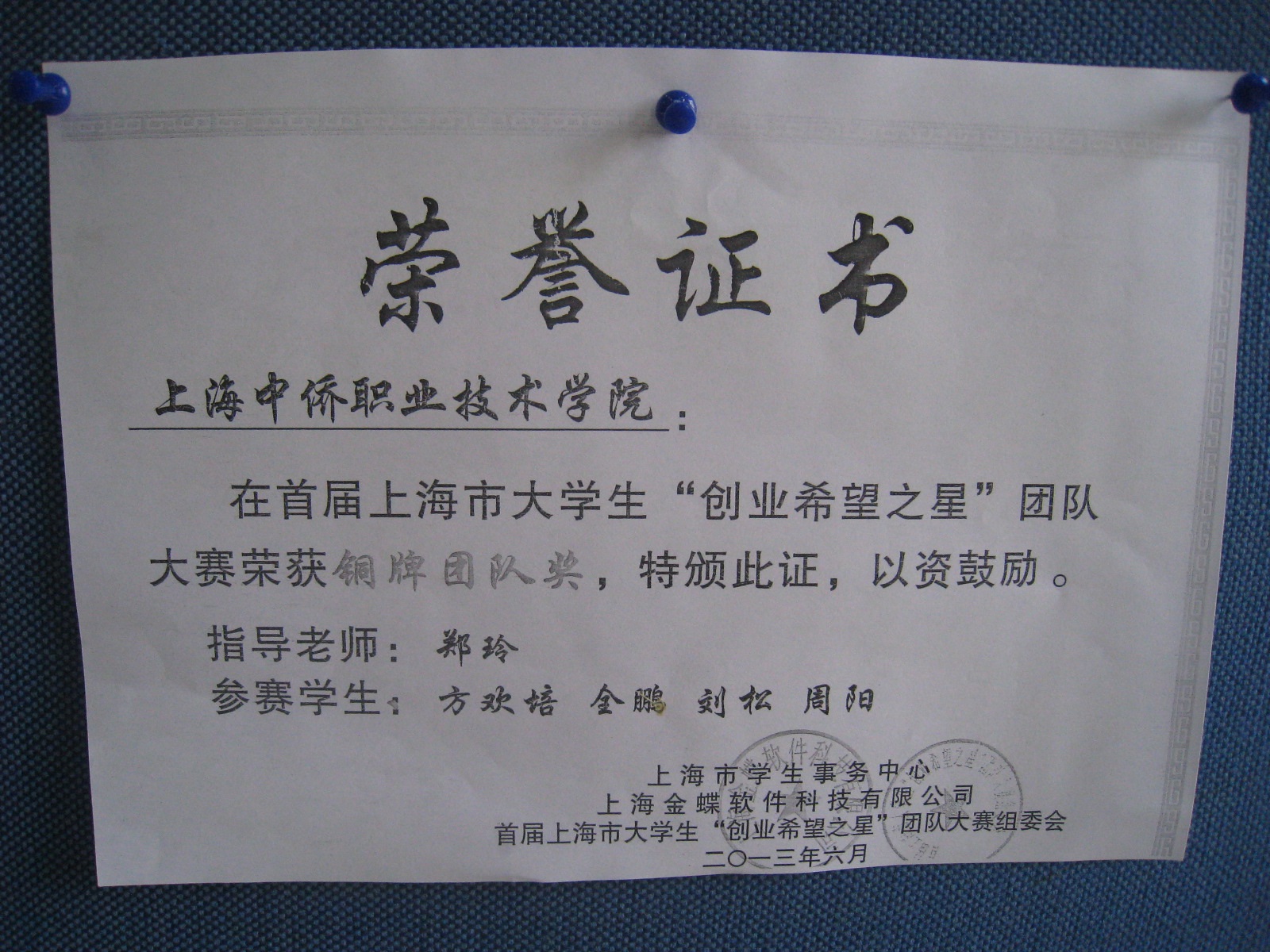 2013年6月21日在上海第二工业大学大学生创业比赛中,我系学生周阳、方欢培与经贸系全鹏、刘松同学于顶住压力,不负众望,最终荣获上海学生事务中心举办的首届上海大学生“创业之星”团队大赛“铜牌团队奖”。本次获奖除了学生们努力,更应感谢郑玲老师动员和细心指导,通过一个月的不懈努力,为学校挣得荣誉,并为“做人、做事、做学”校训和“创新、创业、创值”学校发展总框架填上浓墨重彩一笔。