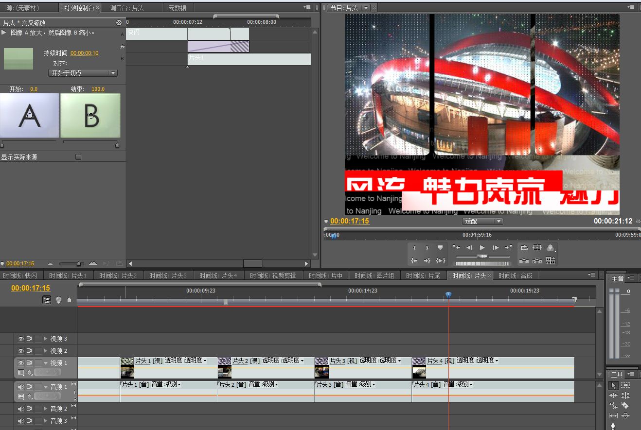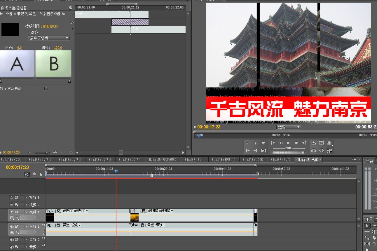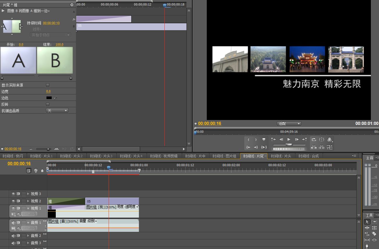 7.依次将时间线“片头”、“片中”、“片尾”拖入时间线“合成”,添加转场