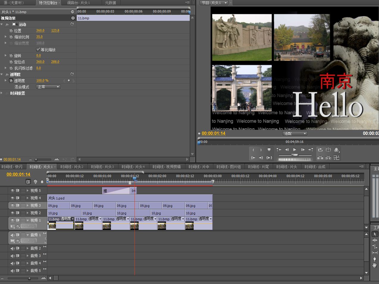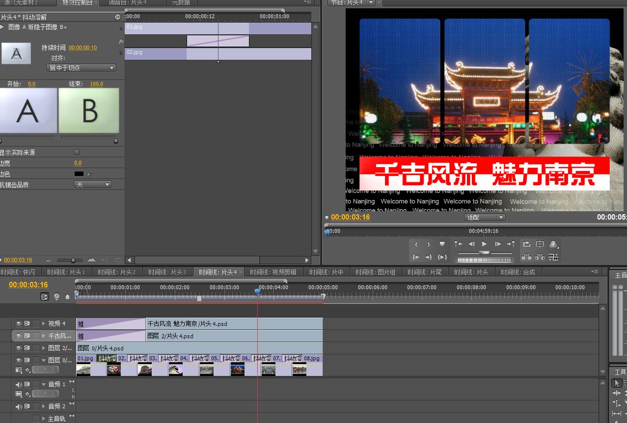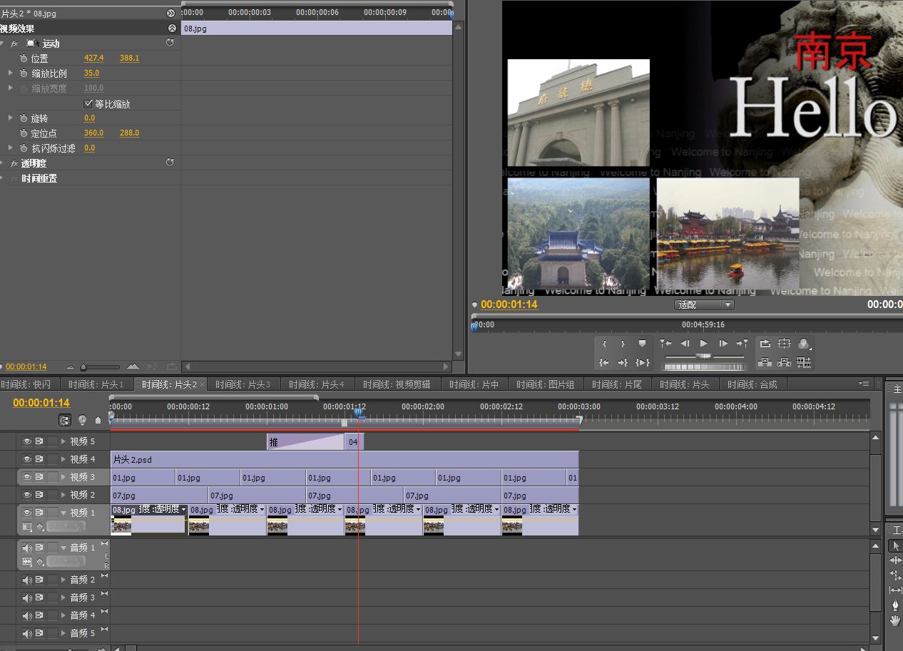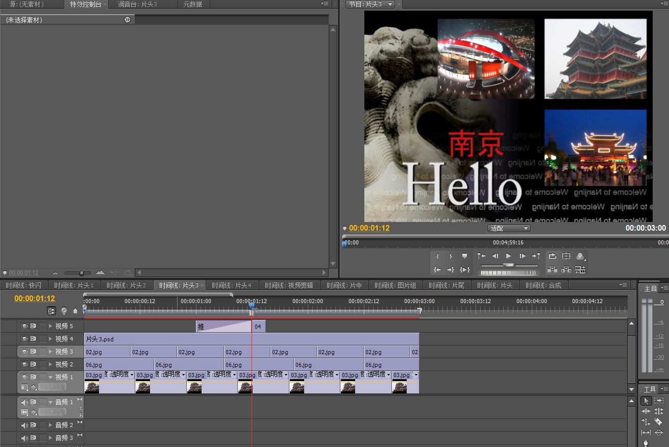 3.利用时间线“片头1”的副本制作时间线“片头2”,时间线“片头3”插入图片,改变字幕位置