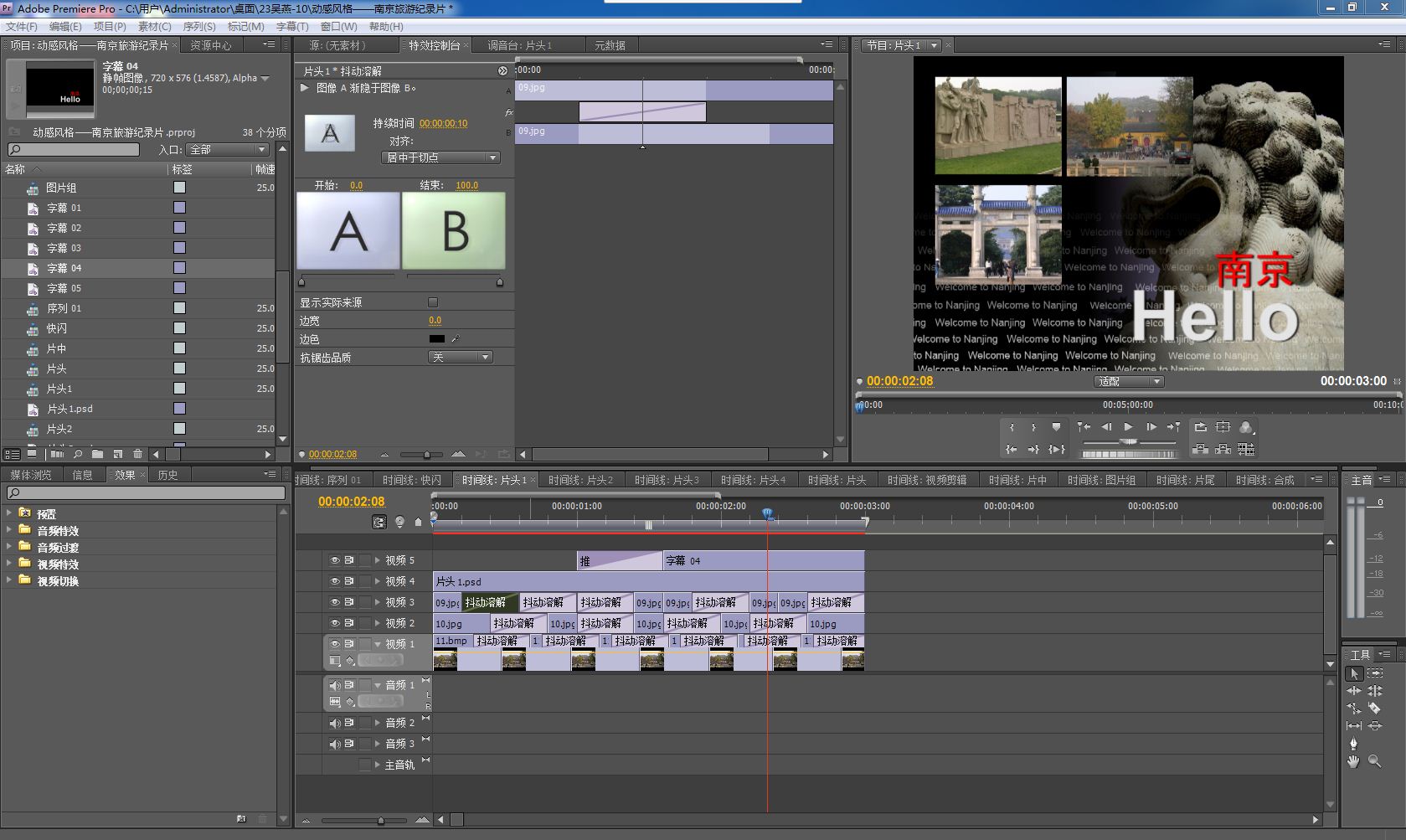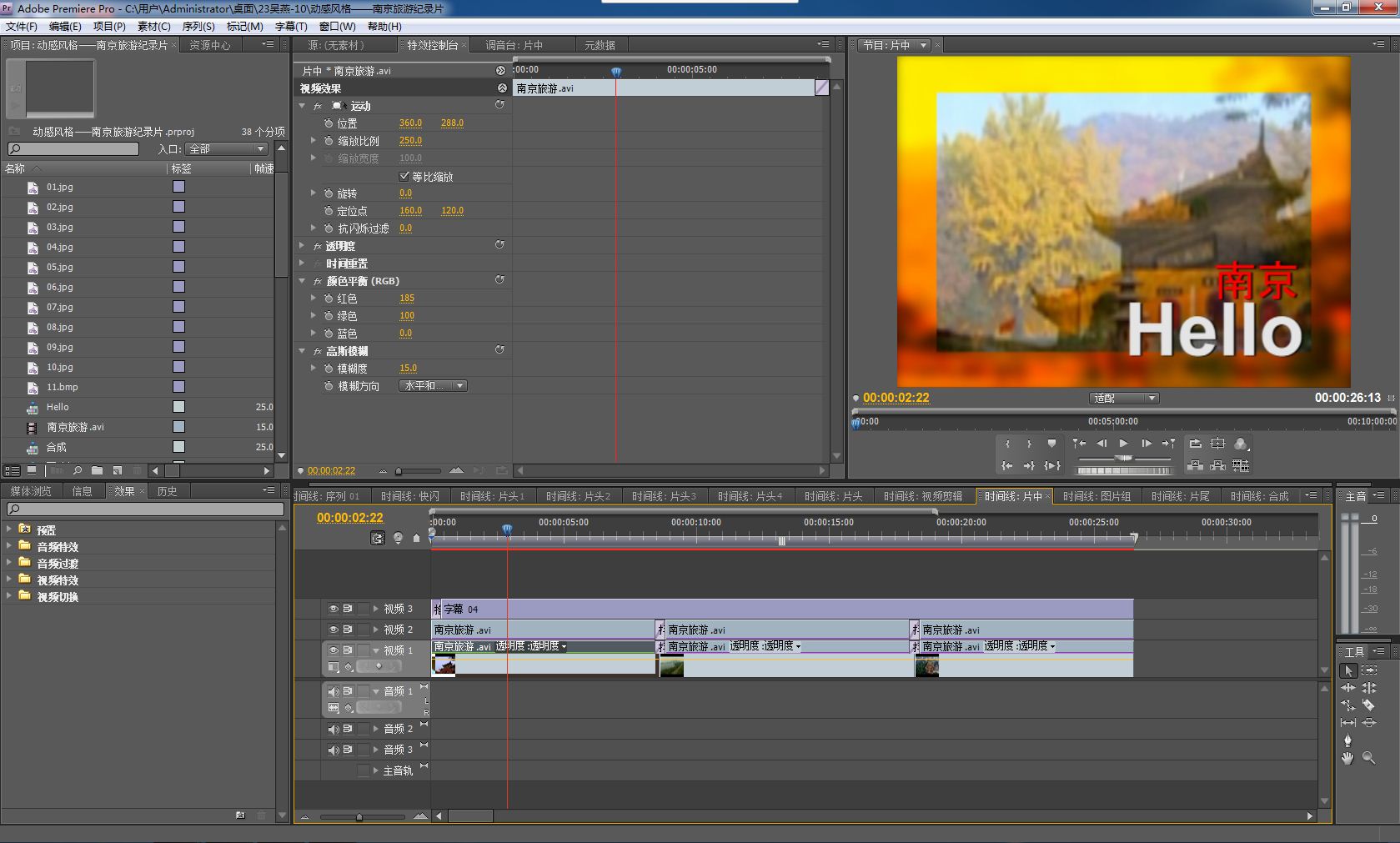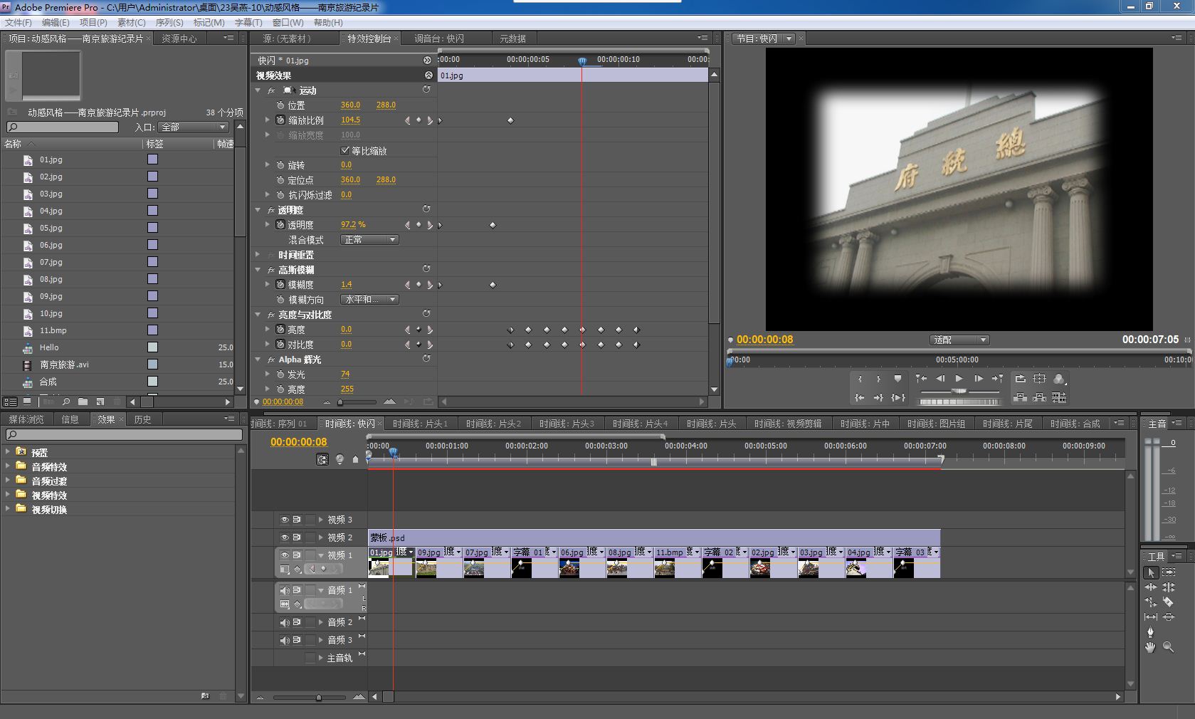 第四天是制作一个南京旅游纪录片,本片的基调为现代,时尚,快节奏,以满足当前人们的欣赏品味,所以,本片的静帧都持续在3秒以内,转场持续在15秒之内,以炫丽夺目的方式展现出来。在制作的时候还添加了很多的特效效果,比如:高斯模糊特效,色彩平衡特效,亮度对比度特效等,让图片与视频之间能有更好的转场效果。