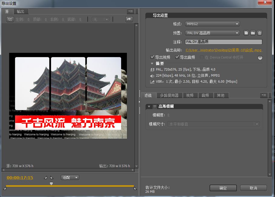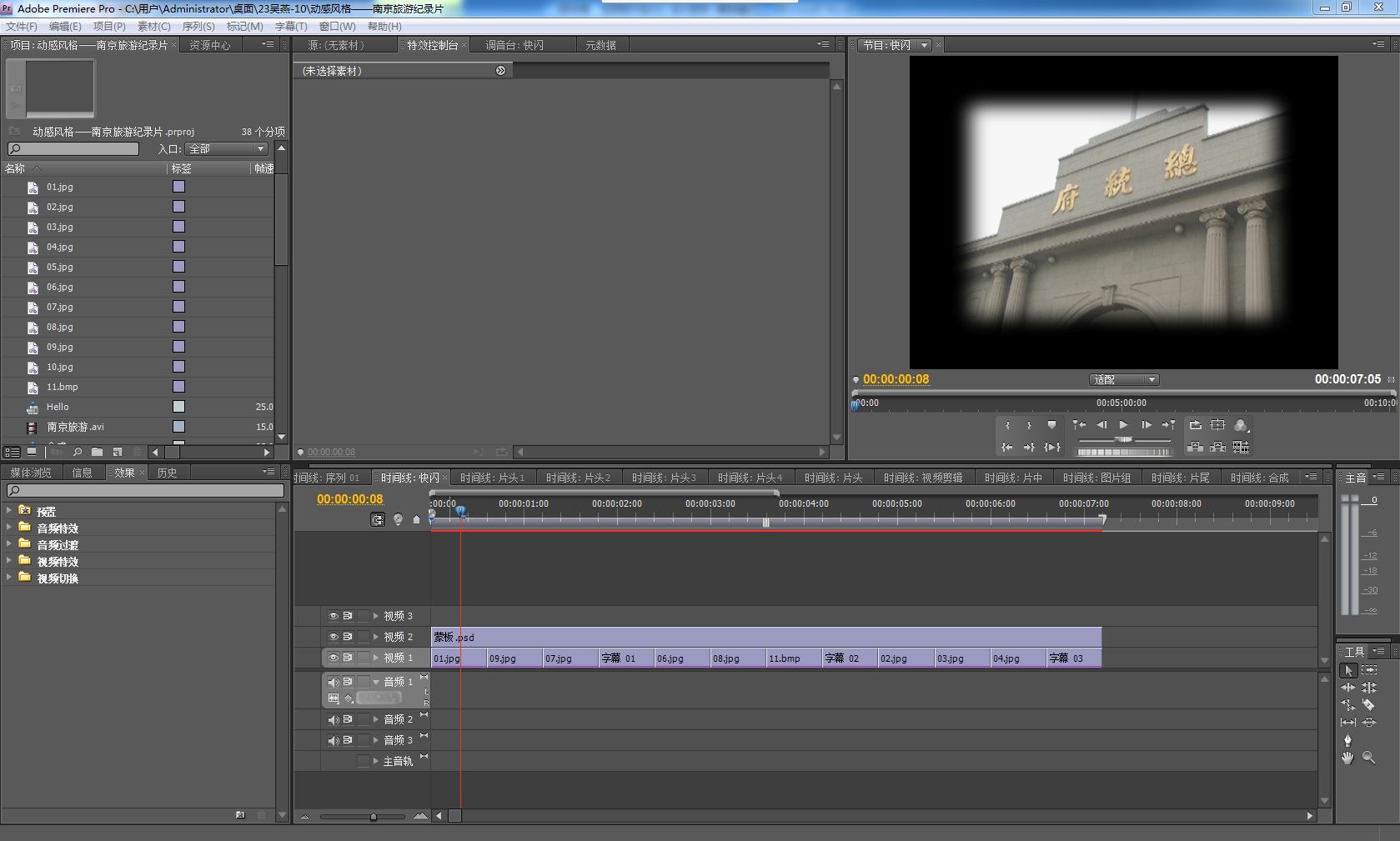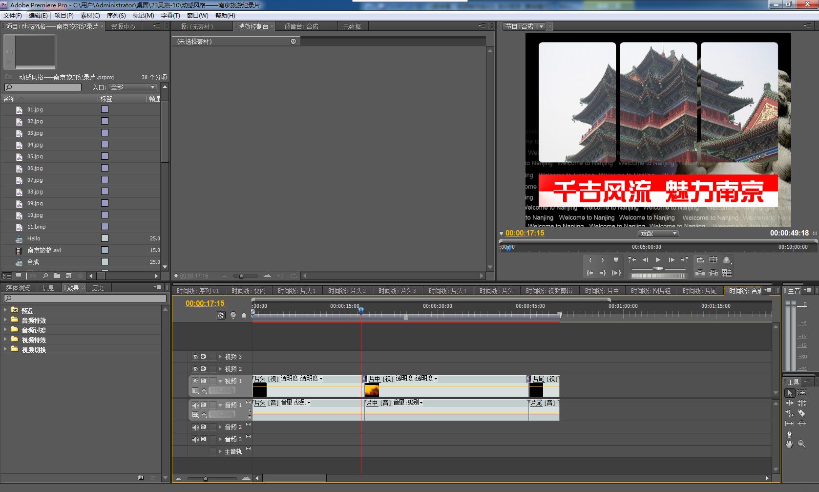 第四天是制作一个南京旅游纪录片,本片的基调为现代,时尚,快节奏,以满足当前人们的欣赏品味,所以,本片的静帧都持续在3秒以内,转场持续在15秒之内,以炫丽夺目的方式展现出来。在制作的时候还添加了很多的特效效果,比如:高斯模糊特效,色彩平衡特效,亮度对比度特效等,让图片与视频之间能有更好的转场效果。