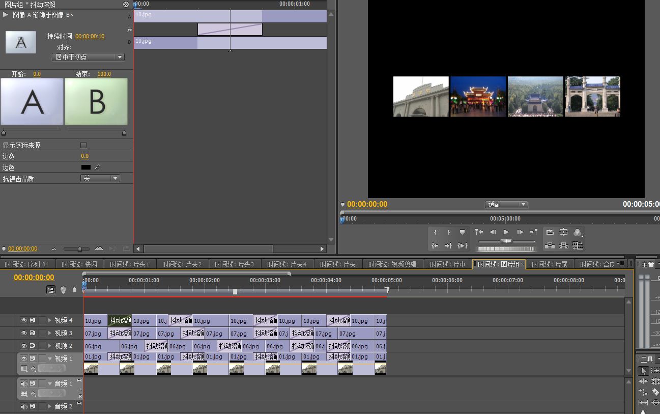 接下来是片头的制作,先制作“片头1”,将素材拖到相应的轨道上,并设置时间分别为3秒,10帧,15帧,12帧,修改图片的比例为35%和图片位置,在每张图片之间添加交叉溶解特效,持续时间为10帧,制作字幕,设置字体,字号,颜色,阴影,添加推动转场,设置方向与时间,就完成了“片头1”,然后利用“片头1”的副本制作“片头2”,“片头3”,“片头4”,将四个制作好的四个片头无缝连接,并添加交叉缩放转场,就完成了片头的制作。