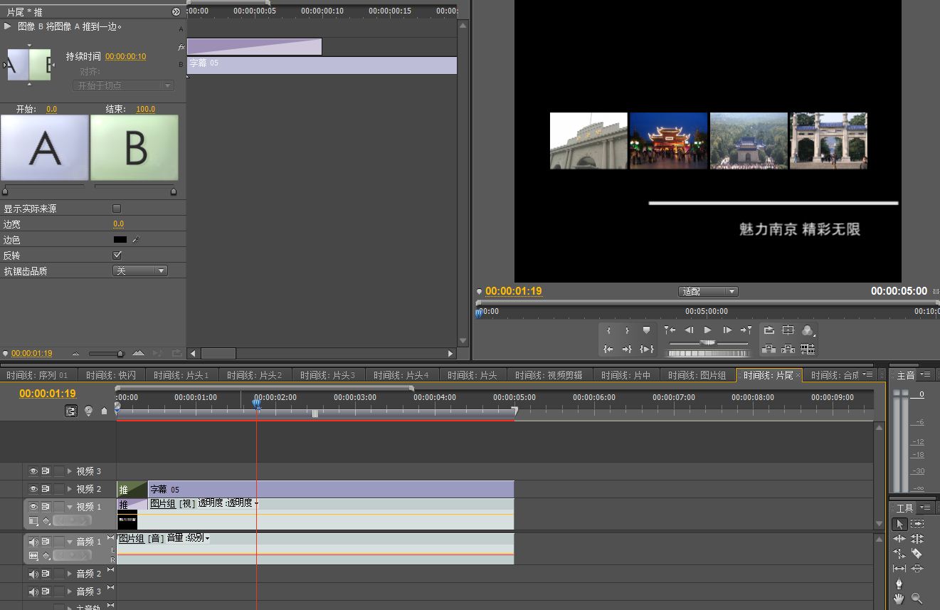 片尾的制作,将图片依次素材拖入时间线上,设置图片的持续时间均为15帧,修改图片大小为20%,设置好图片的排列位置,总时间为5秒,每张图片之间添加交叉溶解转场,持续时间为10帧,注意适当错开不同轨道的转场时间。然后设置字幕,修改字体,字号,颜色,添加推动转场,设置进入的方向与持续时间,这样就完成了片尾的制作。