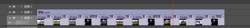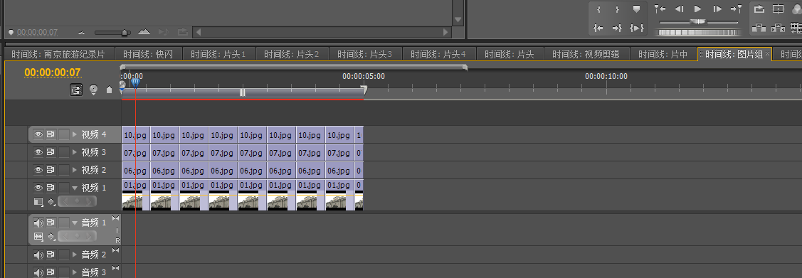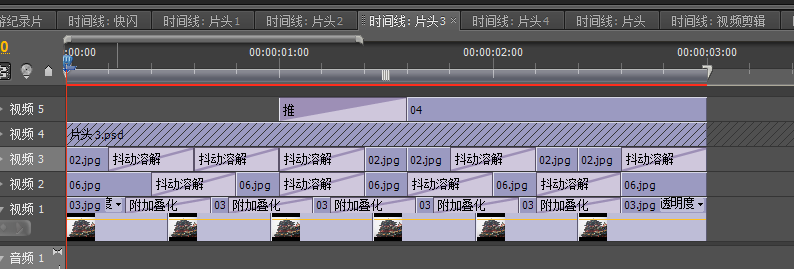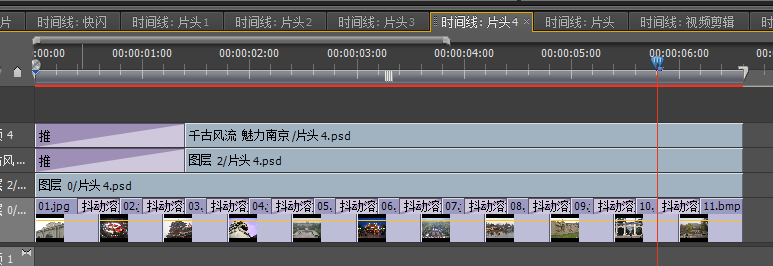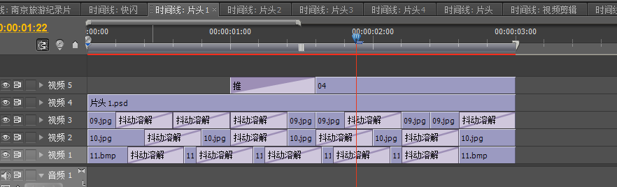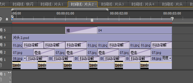 啊打开导入的片头4序列,将原本时间线向上移动一条时间线再讲素材图片添加进时间轴1,再为图片之间添加相应的特效
