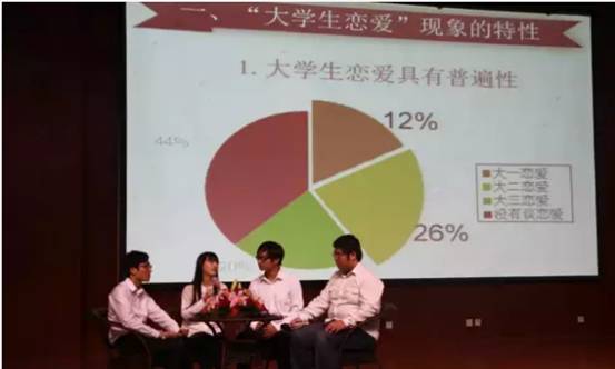 比赛中,我系代表队共4名同学组成,采取座谈讨论的形式,共同探讨大学生恋爱问题。选手们主要从一个反映校园恋爱现象的视频说起,分四个方面深入探讨和表达了大学生恋爱所带来的一系列影响。他们探讨了大学生恋爱的积极正面和消极负面影响,家长和社会对待大学生恋爱的态度变化以及大学生应该如何树立正确的恋爱观的问题。比赛中选手们引经据典,唇枪舌剑,妙语连珠,配上PPT中精彩的视频,权威的调查报告以及鲜活的案例让人耳目一新,赢得在场所有评委的一致好评和台下观众们的阵阵喝彩,最终获得第一名的骄人成绩。