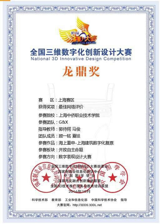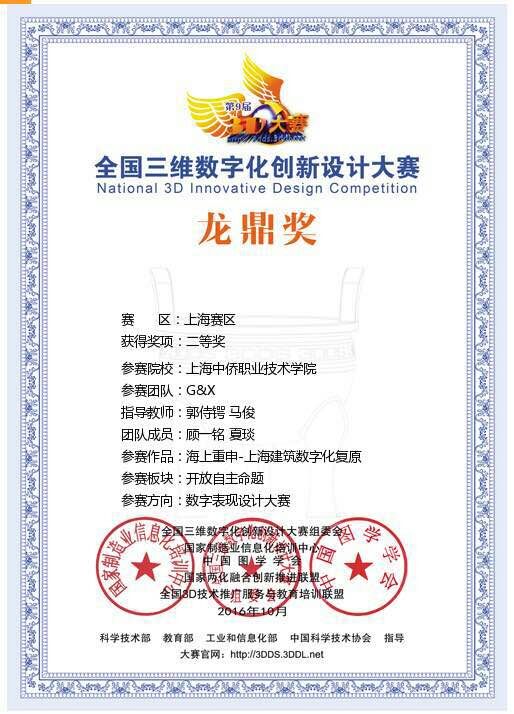 112日传来喜讯,信息技术系数字媒体应用技术专业的4名学子获得2016年“龙鼎奖”全国三维数字化创新设计大赛上海赛区得两个二等奖,并赢得参加全国总决赛的资格!