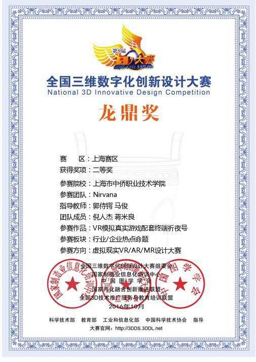 20163月,在信息技术系马俊老师和郭侍锷两位老师的指导下,从14级数字媒体应用技术专业学生中进行了选拔、培训,确定两组学生参加复赛,经过长达5个月的准备和制作,最终,两组选手均突出重围脱颖而出,倪人杰、蒋米良团队的参赛作品“VR模拟真实游戏配套终端祈夜号”获得了虚拟现实VR/AR/MR设计大赛二等奖;顾一铭、夏琰团队的参赛作品“海上重申-上海建筑数字化复原”获得数字表现设计大赛开放自主命题二等奖和最佳网络评价奖。