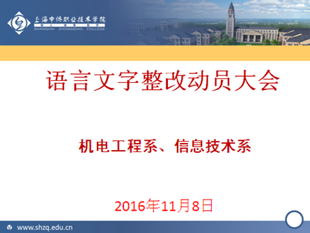 为响学校语委的工作部署,机电信息系于11月8日在4号楼201会议室召开了语言文字整改动员大会,会议由党总支副书记刘群老师主持,两个系全体老师共同出席。刘群老师通过图片等信息给全体老师汇报了近期系里自查活动的开展情况,并根据自查情况进行整改提出了相关要求。
