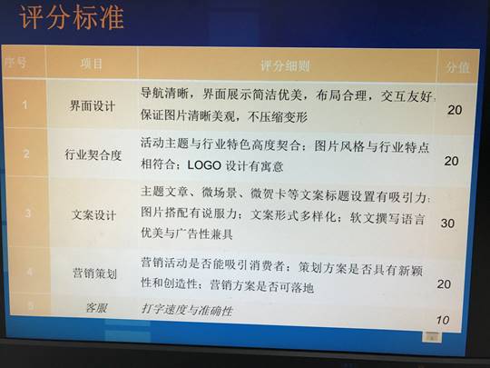 此次电子商务比赛既是加强学生实际电子商务操作能力,丰富和活跃校园文化氛围促进学生之间的团结意识,体现学生自主学习的能力,激发学生创新和设计的潜能;同时也是培养学生良好的道德素养、文化素养、科学素养、人文素养、信息素养、创业素养等。培养做人,做事,做学的能说会做的全面发展、身心健康的合格人才。信息技术系自接到“星光计划”通知以来,高度重视,系主任布置了比赛的工作任务,要求带教教师认真对待,做好宣传、组织报名、培训和比赛的种种事宜。通过宣传,信息系共有32名同学报名参加。经过一段时间集中的培训,于12月8日进行了初赛——商务网站的制作。通过界面设计、行业契合度、文案设计和营销策划四个方面的评比。