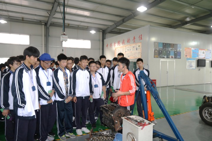 在汽车实训中心里,实验员王海斌老师热情地带领师生参观汽车专业实训设备并作详细的讲解,他鼓励学生要认真学好专业知识、积极参加技能比赛,并期待三年后这批学生到实训中心里上课学习。不少学生是第一次进到汽车实训中心,已经对实训中心里的拆装汽车设备产生浓厚兴趣,摩拳擦掌,跃跃欲试。