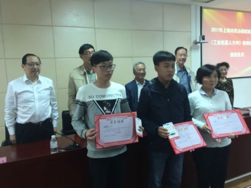 2017年10月14日,上海电气集团培训基地举行的2017年上海民办高校机电专业(工业机器人方向)教师技能比武决赛上,我校信息与机电学院机电一体化专业主任赵惠老师带领2016机电一体化专业孙文兵和平津京两名学生共同设计的《工业机器人在卷筒纸包装生产线的应用》方案获得本次教学比武二等奖。