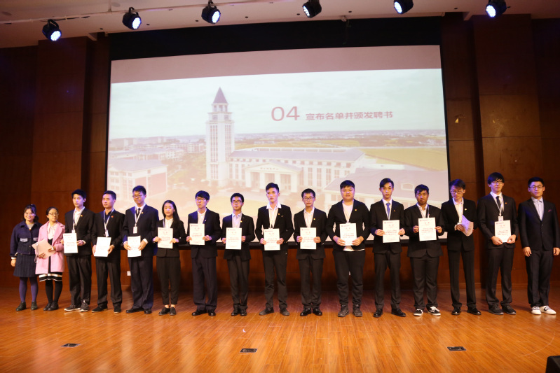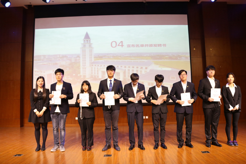 会议第四项议程:吴剑老师宣布新一届干部名单,由嘉宾为新一届学生干部颁发聘书。伴随着激昂音乐,干部们各个拿着证书站在了领奖台上,但同时我们也都清楚我们手中拿的不止是一张简单的聘书,还有上一届的学长学姐们交递给他们的责任与信任。