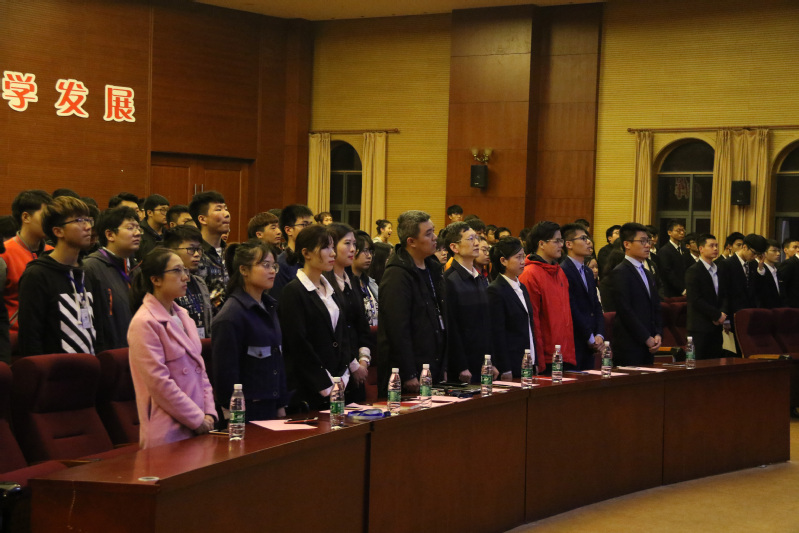 会议第一项议程:全体师生起立奏唱团歌,全体人员端庄严肃,气氛庄重但也不失生气,透露出我们的新血液斗志昂扬的朝气。