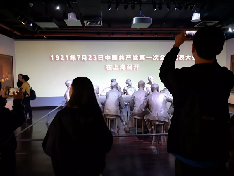 就在我们到达目的地准备排队进入会址参观时,旁边就有位导游在讲解着中共”一大的奇闻异事。在他的讲解声中,我们不知不觉就已经进入了一楼大厅,正前方是出席一大的十三位代表纪念墙,左手便是一张党旗,庄重而又严肃。