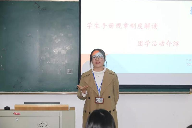 分团委书记种晓老师为大家介绍学生在校的一切行为规范都要符合校规校纪,大学注重培养学生的多样性和自主实践性,但是学生的基本要务“学习”要首先抓牢。同时她还介绍了学校丰富多彩的团日和校园活动。