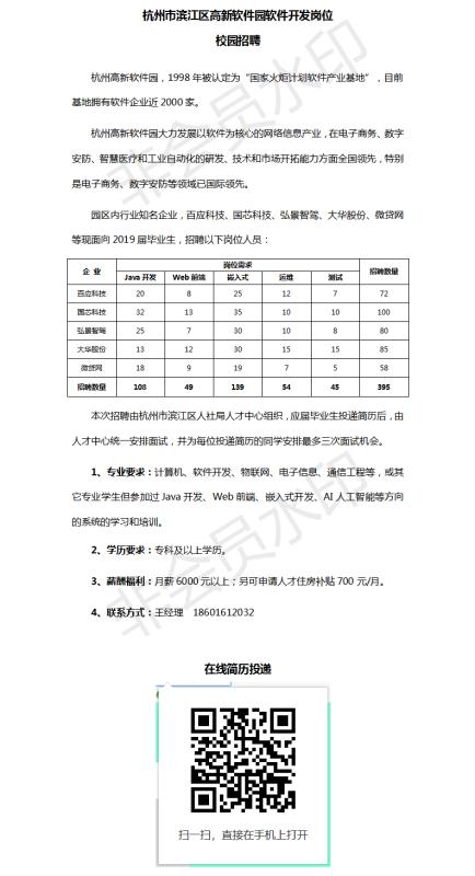 杭州市滨江区高薪软件园软件开发岗位校园招聘