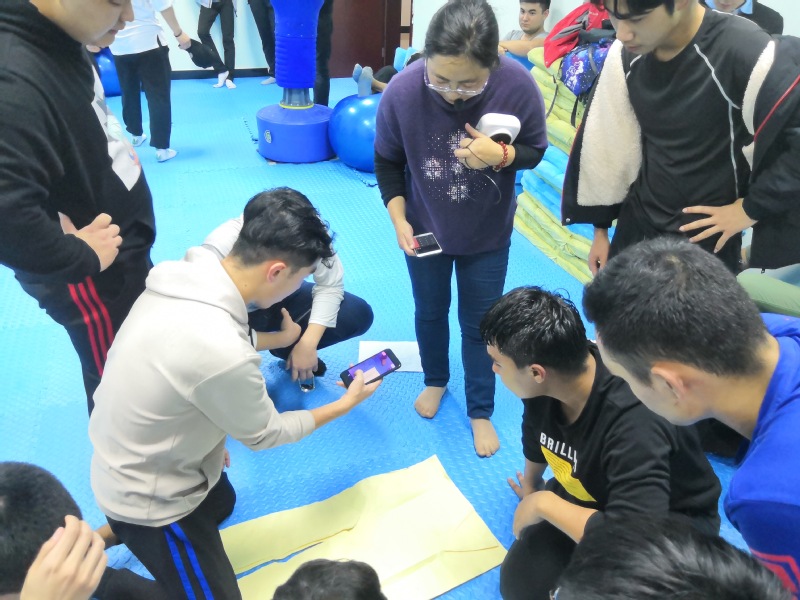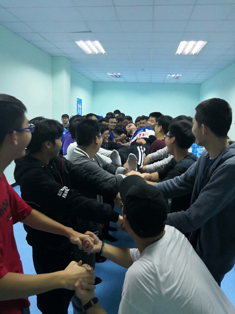 其次,马老师带着所有同学面对面站成两排,完成“蛟龙过江”游戏。其中一个同学站到队伍最前面,要求同学对于其他同学需要绝对的信任,最后其余同学把队伍最前面那个同学最终传递到队伍的尾部,传递过程中每个同学都必须要对对方有绝对的信任,这让大家体会到了同伴间信任、合作的力量。