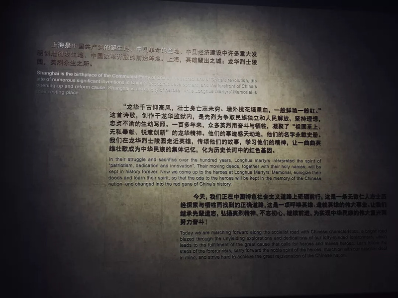 从陵园大门进去,两边整齐的松柏让园区的气氛显得非常严肃与庄重。陵园走道两边石碑有刻着一列遒劲大字“杀身成仁,舍生取义”。走进烈士陵园深处,就可以看到开阔的纪念广场。广场的中央是红色的花岗石纪念碑,纪念碑上刻着江泽民同志题的词“丹心碧血为人民”,它的后面即是巍峨壮观的龙华烈士纪念馆。龙华烈士纪念馆用它的现代科技技术、照片、文字讲解和幸存下来的珍贵文物这种独特的方式向我们“讲述”了上海地区自1840年以来为中国的独立、自由、解放和革命事业而献身的235名革命先烈、革命先驱的英雄事迹,我们看着眼前的烈士们的遗物以及耳边响起的隆隆的炮火声仿佛回到了那个艰苦卓绝的年代。