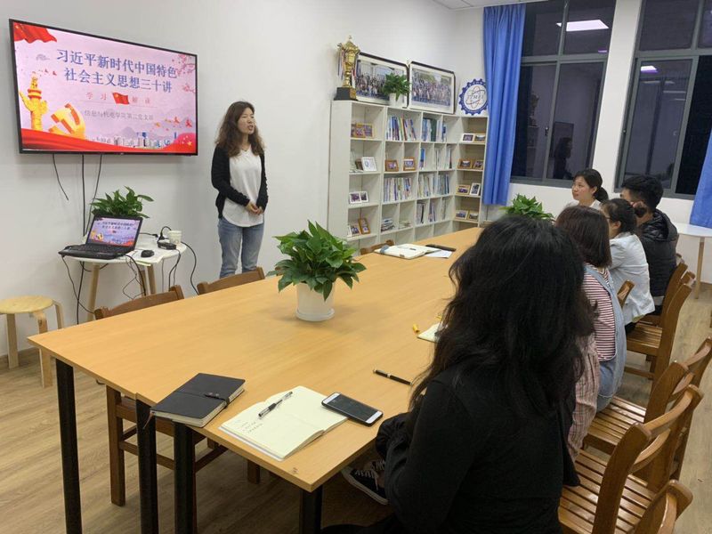 信息与机电学院第二支部于2019年4月22日在9号楼304开展了关于《习近平新时代中国特色社会主义思想三十讲》的学习会,会议由信息与机电学院第二支部书记杨芬菲老师主持。