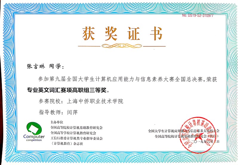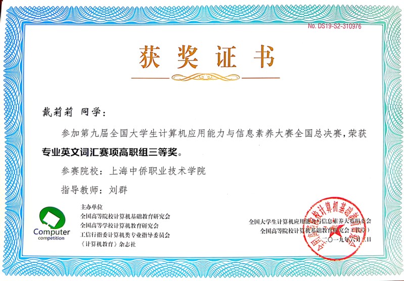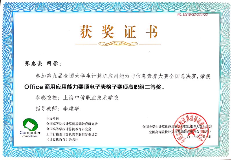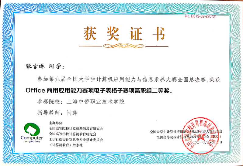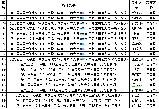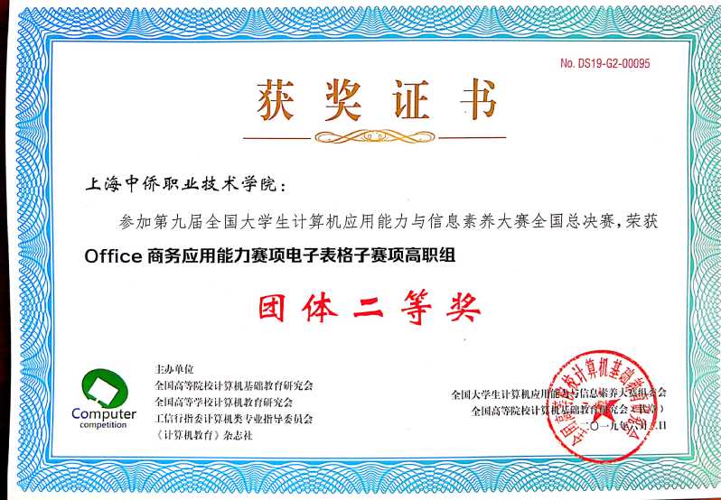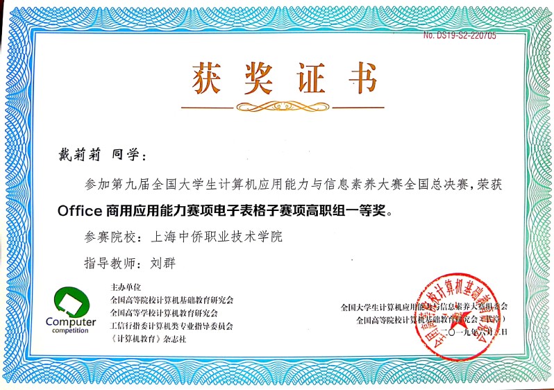 闫萍、李建华、刘群指导的张言琳、张忠豪和戴莉莉三位同学组成的参赛队最终获得“OFFICE商务应用能力赛项电子表格赛项”团体二等奖。其中戴莉莉同学获得电子表格赛项赛项一等奖,专业英语词汇赛项三等奖;张忠豪同学获得电子表格赛项赛项二等奖,专业英语词汇赛项三等奖;张言琳同学获得电子表格赛项赛项二等奖,专业英语词汇赛项三等奖的荣誉。大赛内容参照了国内外知名计算机评测标准与要求,以考察大学生信息素养和实践能力为出发点,旨在激发大学生学习计算机基础知识、技能的兴趣和潜能,提高其运用信息技术解决实际问题的综合能力。