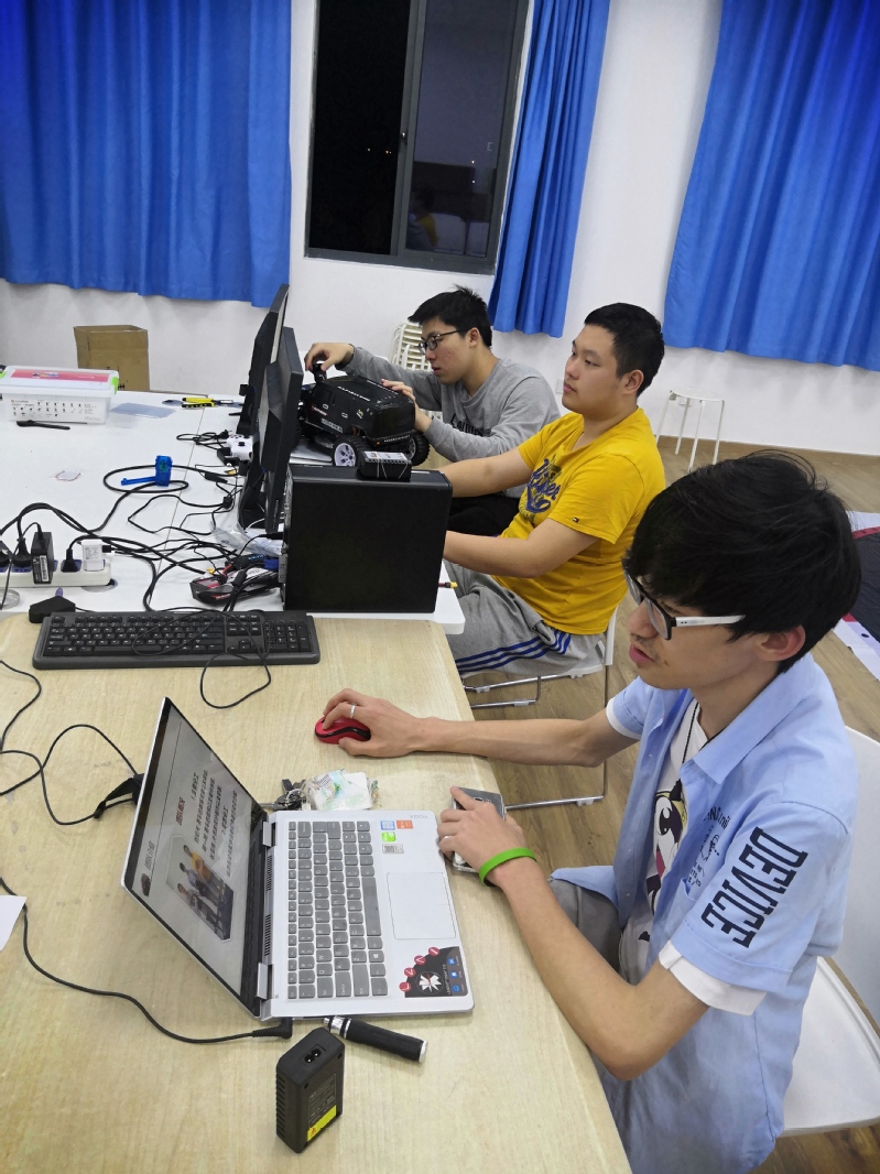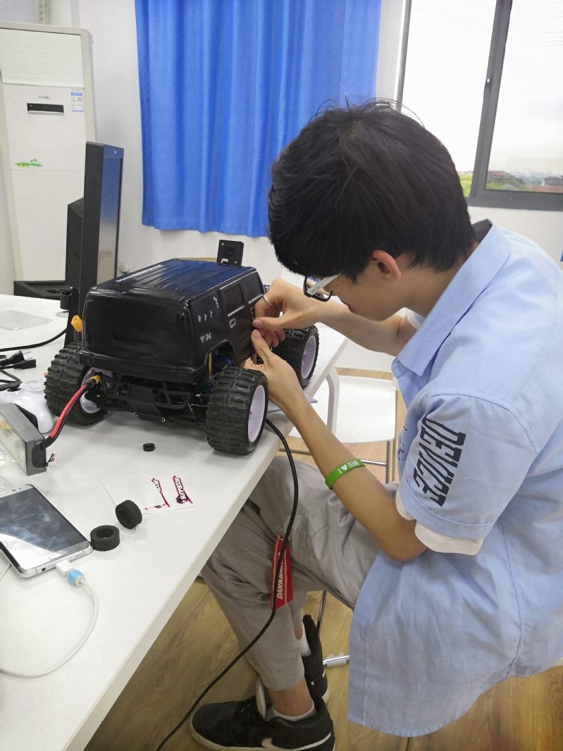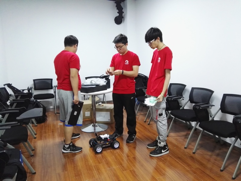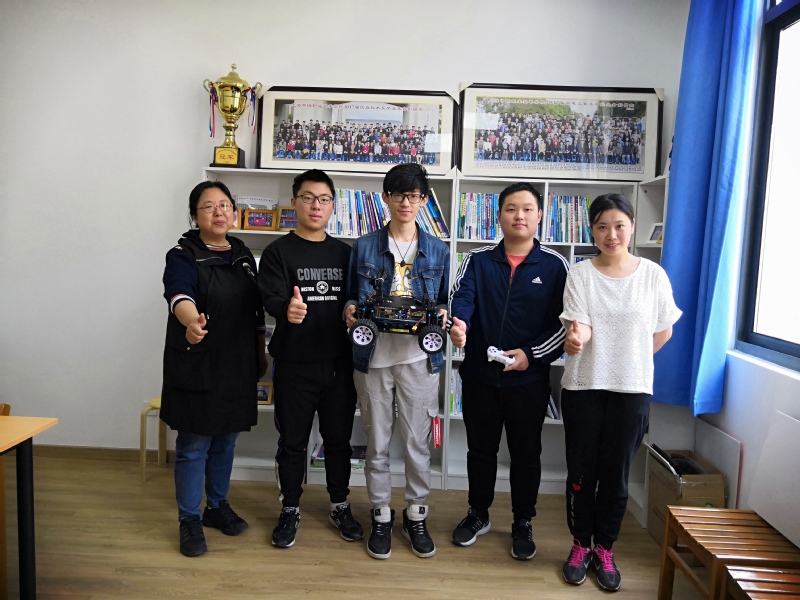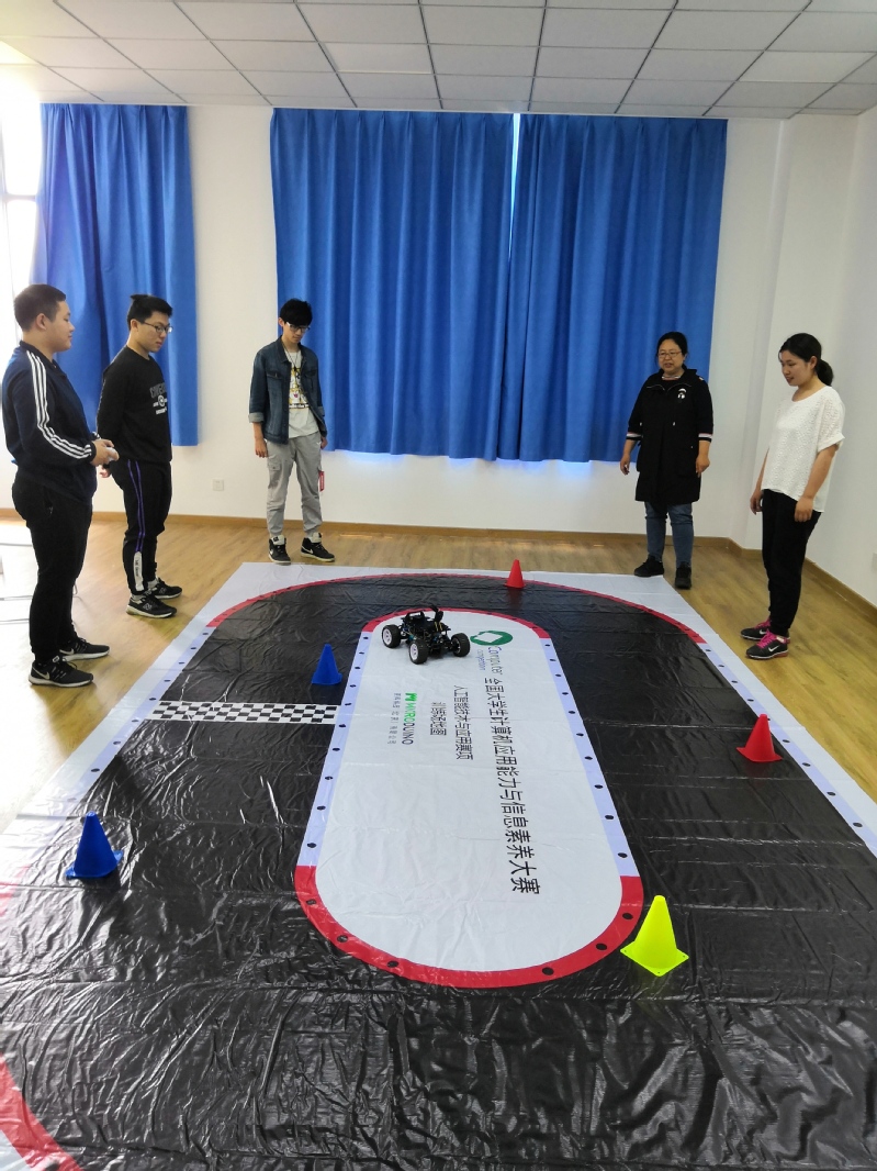 赵欣和刘群两位老师指导的张亚炜、刘纪天、胡一铭三位同学组成的参赛队获得人工智能赛项三等奖。该赛项考核内容主要是让自动驾驶汽车经过自主学习之后,在自动躲避障碍物的前提下完成竞速比赛。无人驾驶汽车考核项目同样重视车体外型的设计与制作,同学们经过3D建模设计制作汽车外形,比赛时除了完成展示造型,同学们也完美地完成了竞速比赛,并用精彩的答辩,给现场评委老师留下了深刻的印象。