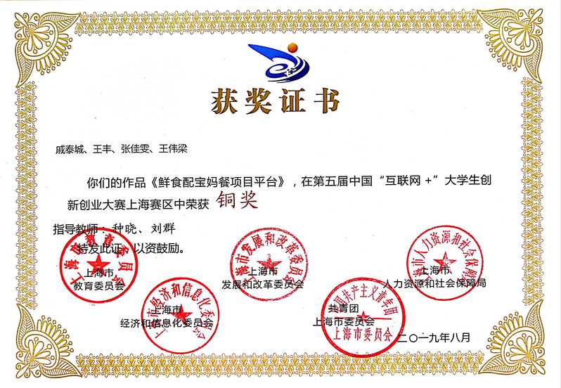 种晓、刘群老师指导的“鲜食配宝妈餐平台“(戚泰城,王丰,张佳雯,王伟梁)项目获得铜奖。
