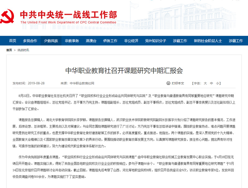 作为中央统战部2019年度重点课题,“职业院校和行业企业形成命运共同体研究与实践”是为了深入贯彻落实关于“职业院校和行业企业形成命运共同体”的指示以及全国教育大会和《国家职业教育改革实施方案》精神,由中华职业教育社与机械工业教育发展中心联合实施。2019年4月18日在无锡举行了开题会,我校信息与机电学院副院长赵欣主持承担了子课题“命运共同体视角下职业院校的主体责任研究——以上海中侨职业技术学院信息与机电学院为例”。在开展课题研究期间,课题组成员围绕课题主题针对10个合作企业进行了深入调研,广泛研究,形成了一份调研报告、并报送了两个典型案例,对职业院校和行业企业深度产教融合、校企合作,推动形成命运共同体具有一定的参考价值。