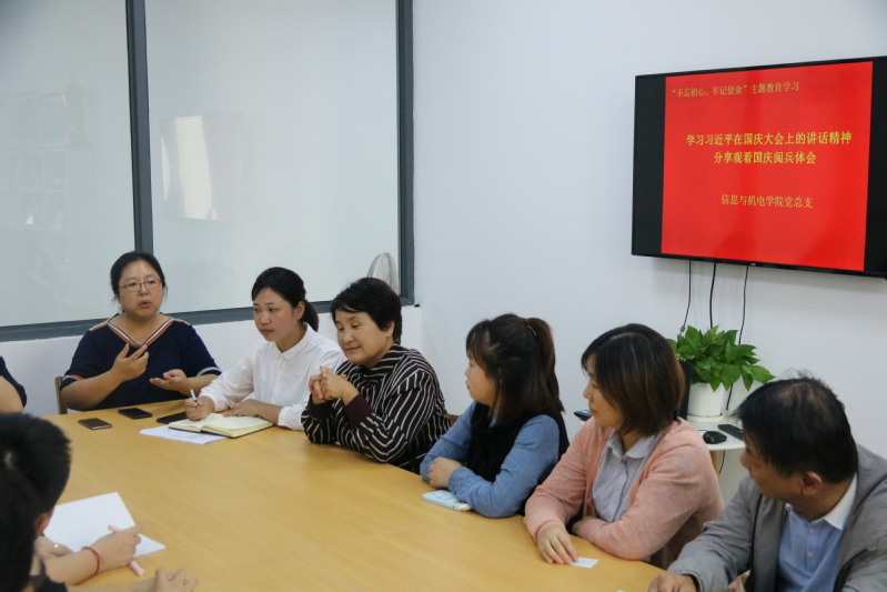 10月8日中午,信息与机电学院召开全体教师会议,学习传达习近平总书记在国庆70周年大会上的重要讲话精神,并交流观看国庆阅兵体会。党总支书记刘群主持会议。