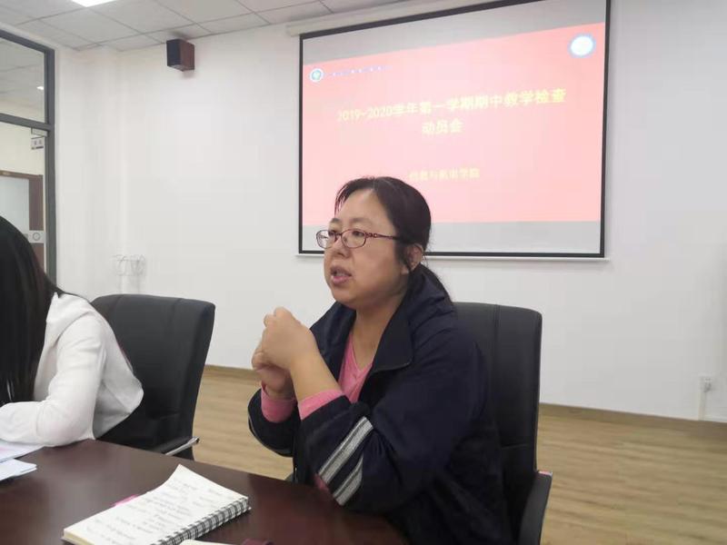 会议开始由教学秘书陈露传达了10月28日教务处召开的教学工作会议精神,布置期中教学检查任务,明确辅导员、实验员、任课老师、专业主任、教学院长的任务要求,落实到每一位老师,积极响应教务处领导的号召,按时按质按量完成期中教学检查。
