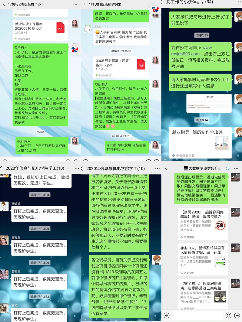 围绕疫情防控,他们以学生身心健康安全为立足点,与学生保持密切联系,主动及时摸清掌握学生动态。通过主动联系每一位学生,准确掌握每一个学生所在地区,思想状态、健康状况等信息,确保不漏一人,不漏一事,并随时沟通情况,每日汇总上报,靠前解决学生思想、心理和学习生活等实际问题,实现与每一位学生“心连心”的沟通,引导学生不随意传播网上未经求证的消息,不信谣、不传谣、不恐慌、不给疫情防控添乱。以微信公众号、QQ、朋友圈、微信群等网络新媒体为载体,以威佰通、钉钉、腾讯会议等平台为工具,以主题班会直播等形式引导全体学生强化对疫情防控的理性思考,引导学生合理规划“加长版”假期生活,引导学生做到“停课不停学,学习不延期”,在危难时刻更要发扬爱国热情,始终与祖国同命运,与人民共患难。