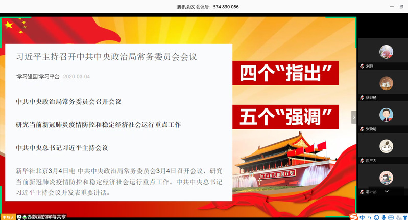 首先,胡婉君老师通过PPT讲解带领大家集中学习了2月23日习近平总书记在统筹推进新冠肺炎疫情防控和经济社会发展工作部署会议上的讲话以及3月4日习近平总书记在中共中央政治局常务委员会会议讲话精神。习总书记在讲话中指出,当前疫情正处在关键阶段,统筹推进疫情防控和经济社会发展任务艰巨,要充分发挥党员的先锋模范作用。全体党员要毫不放松,抓紧抓实抓细疫情防控工作,进一步做好各方面工作。在这场大考中磨砺责任担当之勇、科学防控之智、统筹兼顾之谋、组织实施之能,做到守土有责、守土有方,为取得这场疫情防控人民战争、总体战、阻击战的最后胜利而不懈奋斗。