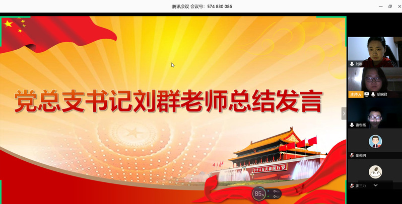 最后,党总支书记刘群老师进行总结发言,号召学生第二党支部全体党员找定位、明目标,非常时期体现党员社会担当责任。她强调,教师党员要坚定信心、保持定力,以更加昂扬的斗志践行初心使命,确保学校防疫期间线上教学、线上办公等质量不减;学生党员要带头安排好自己毕业毕业设计和实习的任务,不断加强学习,担负起作为一名大学生的责任,为自己即将踏上工作岗位做好准备,为实现中华民族的伟大复兴贡献出一份力量!