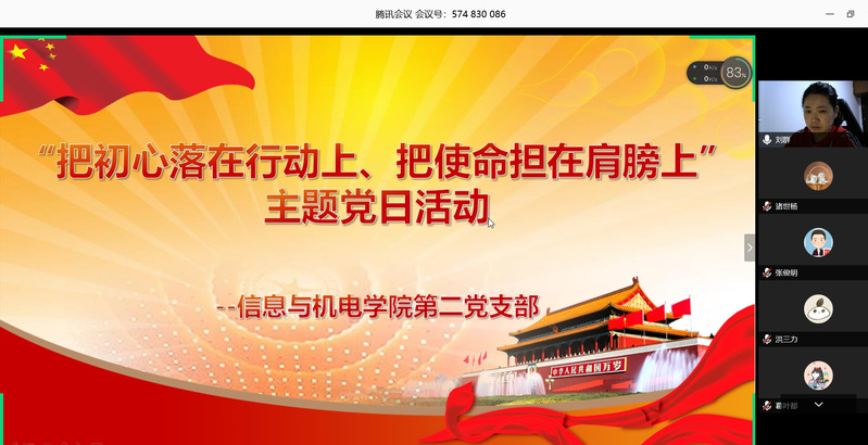 为进一步做好新冠肺炎疫情防控工作,充分发挥党支部政治核心和示范引领的作用,信息与机电学院第二党支部在2020年3月28日18:30利用腾讯会议开展了以“把初心落在行动上、把使命担在肩膀上”的主题党日活动,全体党员出席,一起认真学习习近平总书记重要讲话精神,谈思想、谈认识、谈体会、谈行动。此次会议由第一支部书记胡婉君老师主持。