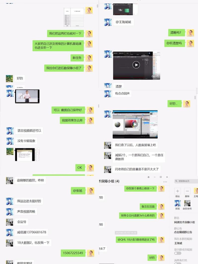 线上教学前一周,通过“威佰通”平台召开了由院领导、专业主任、学院专兼职教师、学生干部等多场教学网络视频会议,同时学院组织了大规模全院师生的线上教育动员会和技术指导会,让学院师生快速熟练地掌握了在线教学平台。学院在开课前要求教师进行在线教学压力测试,对于测试过程中有问题的地方及时解决。网课技术保障小组为学院8个专业、教研室的教师提供全天候一对一在线技术保障服务,及时解答和解决老师们在网络授课过程中遇到的问题。