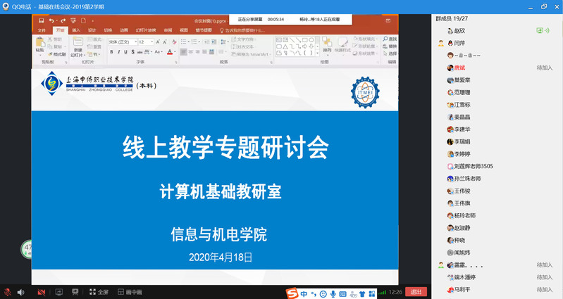 为了更好总结线上教学经验,进一步提升线上教学质量,信息与机电学院计算机基础教研室在4月17日15:30利用QQ平台召开了线上教学专题研讨会。会议教研室主任闫萍老师主持。