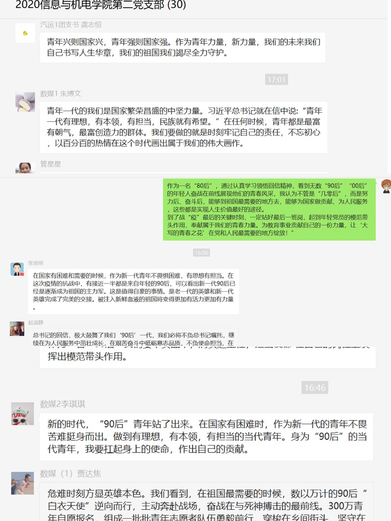 信息与机电学院学生党支部,各班团支部以专题学习会、主题班会等形式积极开展“学习回信内容,展现青年担当”为主题的线上学习分享活动,结合全国抗疫形势,认真学习新思想,党员、团员们掀起了学习热潮并积极分别分享学习心得和感悟。这封回信,字不多,意蕴丰厚;文不长,思想隽永,字里行间既体现了对北京大学援鄂医疗队青年的亲切关怀,也充满了对广大青年成长成才的殷切期望。习近平总书记指出,青年一代有理想、有本领、有担当,国家就有前途,民族就有希望。我们青年人一定要认清肩上的使命和责任,树立远大志向,磨砺坚强意志,脚踏实地、爱岗敬业、服务社会,努力让青春在党和人民最需要的地方绽放绚丽之花。