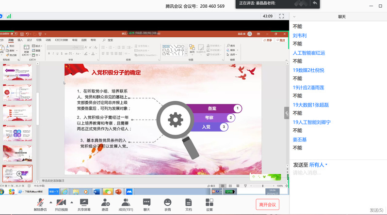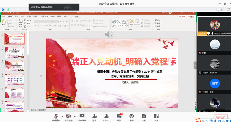 2020427日晚上1830,中侨学院第四分党校第七期入党积极分子培训班第二次党课通过借用腾讯会议顺利举行。本次党课的主讲人是信息与机电学院党总支宣传委员姜晶晶老师,主题为《端正入党动机 明确入党程序》。