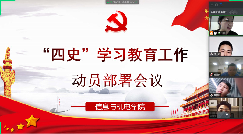 为深入贯彻落实习近平总书记重要讲话精神,按照学校部署,把开展党史、新中国史、改革开放史、社会主义发展史学习教育作为建立不忘初心、牢记使命长效机制。5月20日下午16:00,信息与机电学院党总支通过腾讯会议平台召开了“四史”学习教育工作动员部署会,学院党政班子全体成员、支部书记、师生党员参加了会议。会议由党总支书记刘群老师主持。