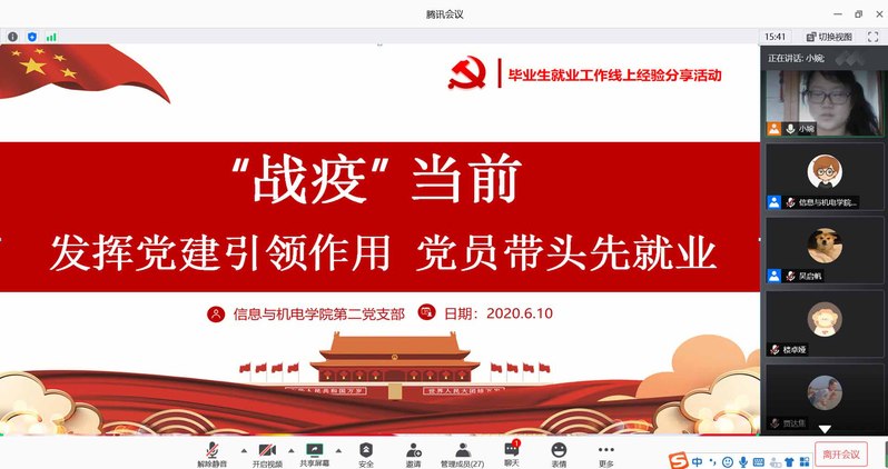 在疫情背景下,毕业生就业受到了极大影响,为了发扬党支部全心全意为人民服务的根本宗旨,充分发挥党员的先锋带头模范作用,促进毕业生顺利就业,信息与机电学院第二党支部于6月10日下午17:00利用腾讯会议召开线上就业工作线上经验分享会,围绕毕业生职业发展和就业形势分析召开专题研讨会,要求学生党员想在前、走在前、做在前,为就业工作探路排障。活动由党支部书记胡婉君主持,支部全体党员以及部分入党积极分子参加会议。