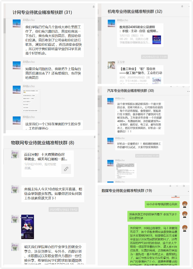 大家纷纷行动起来,立即开展相关工作,号召支部党员积极行动,并将帮助对象责任到人,实行“一对一”找工作线上协助计划。采用线上分专业建群的形式建立待就业精准帮扶微信群,及时发布各种就业招聘信息、国家政策、求职指导等信息,及时反馈学生的就业动态和需求。一对一帮扶与每一个未就业毕业生进行一对一的谈心谈话,引导学生理性、全面看待就业形势,对学生的就业需求形成有效指导帮扶。对未就业的同学进行心理疏导,缓解疫情下就业难引起的焦虑情绪,另一方面协助其查找就业信息,帮助搜寻相关单位的笔试面试相关试题,积极帮助其修改简历。