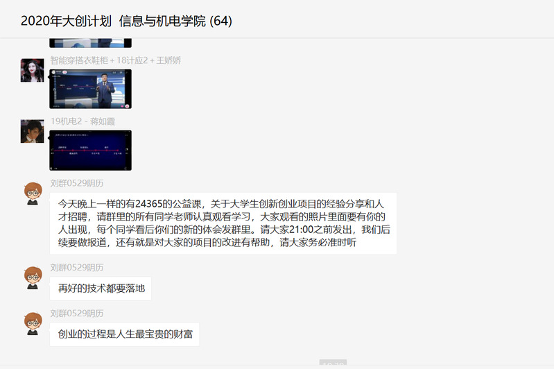 5月17日晚七点,我院应学校要求,重点组织2017、2018级学生,鼓励动员创新创业参赛学生积极参加教育部24365校园招聘服务互联网+就业公益直播课程第七讲——“勇立潮头 敢闯会创”大学生创新创业项目经验分享和人才招聘。中国“互联网+”大学生创新创业大赛获奖选手,介绍创业历程,讲述如何在创业活动中克服重重困难、坚定初心选择,通过创业实践获得职业能力的高速发展,带动更多毕业生就业,为他人、社会和国家创造更大价值,不断追逐人生理想的故事。其中包括: