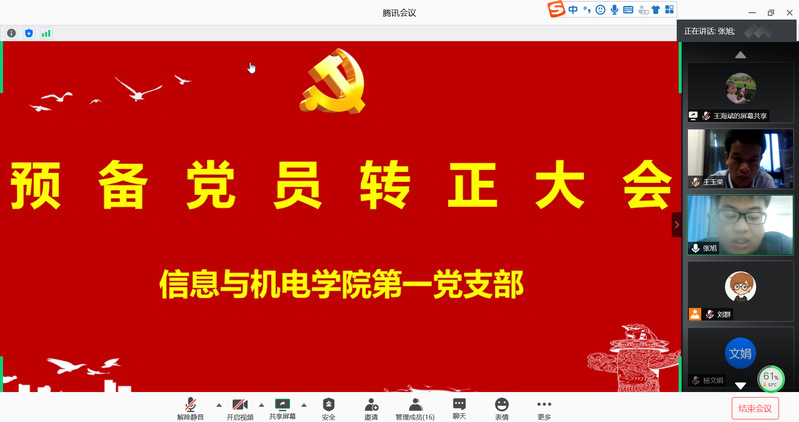 2020年7月3日下午,信息与机电学院第一党支部预备党员转正大会通过腾讯会议线上庄严召开。支部全体党员出席大会,大会由党支部书记赵欣同志主持。