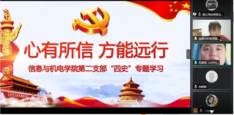 为深入贯彻落实“四史”学习要求,引导党员坚持理想信念,2020年7月5日20:00,信息与机电学院第二党支部开展了以“心有所信,方能远行”为主题的“四史”学习交流会。会议有支部书记胡婉君老师主持。