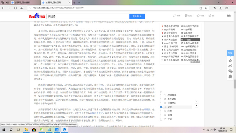 也许是今日无事,也许是出于想尽快完成任务的目的便从百度搜来读了一下,没想到为完成一个任务却让自己感触颇深。从客观的角度,从大的方面来说,我个人觉得它有重大的世界观和方法论意义。初步的了解及把握了《实践论》的基本内涵。总的来说毛泽东的《实践论》是一部关于马克思主义认识论的重要著作,是以社会实践为基础,系统地论证了能动的革命的反映论。学文的都知道:实践的观点是辩证唯物论的认识论的基本观点,实践是认识的基础,是检验真理的标准,是认识的目的和归宿,是认识发展的动力。以实践为基础的认识的辨证过程包括两次飞跃,第一次飞跃是从感性认识——理性认识,第二次飞跃是从理性认识——实践。因此,认识的辩证过程是“实践——认识——再实践——再认识”,如此循环往复以至无穷。在感性认识中获得的丰富的材料,经过去粗取精、去伪存真、由此及彼、由表及里的加工整理,将符合实际的部分上升为理性认识,去指导实践活动和接受实践的检验。