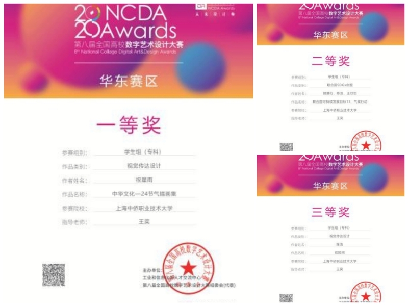 获奖作品中,由18数媒2班祝星雨同学创作的的“中华文化-24节气插画集”荣获一等奖;