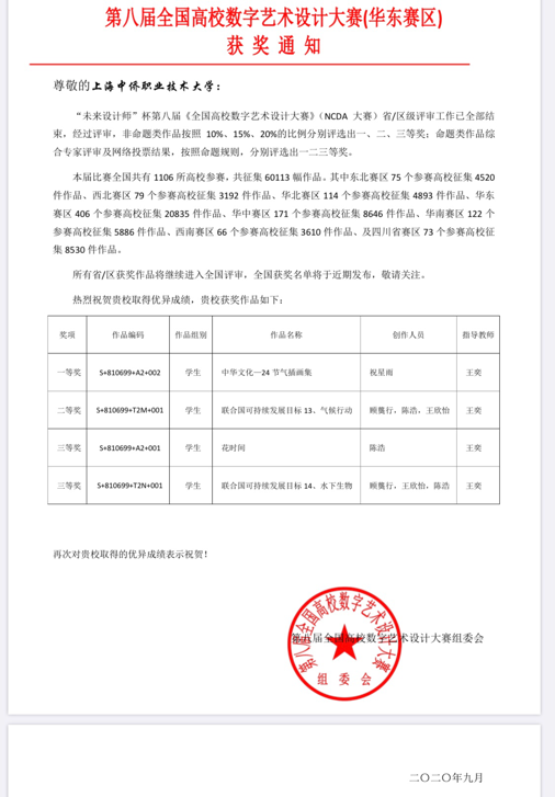 近日,由工业和信息化部人才交流中心主办,NACG数字艺术人才培养工程办公室与未来设计师云承办的“未来设计师”杯第八届全国高校数字艺术设计大赛评审工作全部结束。华东赛区共406所高校参赛,共征集作品20835件,我院师生在此次比赛中荣获一等奖1项、二等奖1项、三等奖2项。