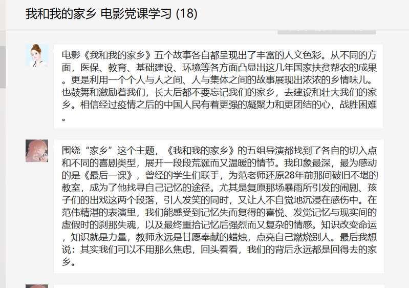 教师党支部书记赵欣老师说道看了《我和我的家乡》,深深地感动了我,改革开放四十年,祖国发生了巨大的变化,人民生活越来越幸福,这些发生在家乡的故事,组成了不断变化中的家乡是如何变美,人民是如何过上幸福的生活,这正是祖国强大变化的缩影。我们这一代人赶上了好时代,赶上了好政策。我们理应为祖国的建设贡献自己的一份力量!
