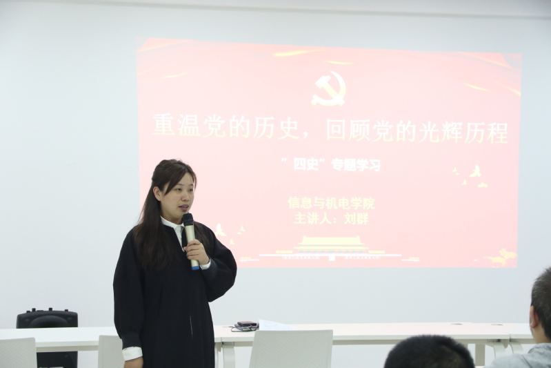 11月5日晚上,第四分党校开展了第一讲的学习,此次主讲老师为信息与机电学院党总支书记刘群老师,她以以“重温党的历史,回顾党的光辉历程”为主题上了一堂生动有意义的党史课。全体员参加了学习。